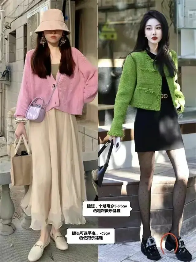 咱们可以选择一件绿色的小香风外套,内搭黑色的连衣裙,脚上踩着一双粗跟的鞋子就够,就能轻松秀出你的大长腿优势。