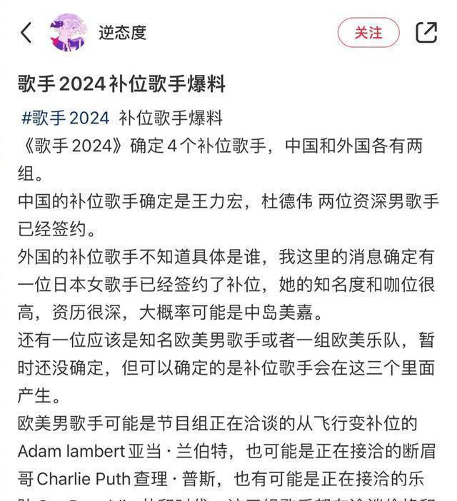 网传《歌手2024》确定4个补位歌手,中外各两组。其中已确定的有王力宏、杜德伟,还有一位已经签约的补位歌手是日本咖位很高的女歌手,大概率是中岛美嘉。除此以外,亚当·兰伯特、"断眉"查理·普斯、共和时代也正在洽谈中,会有其中一个来补位。