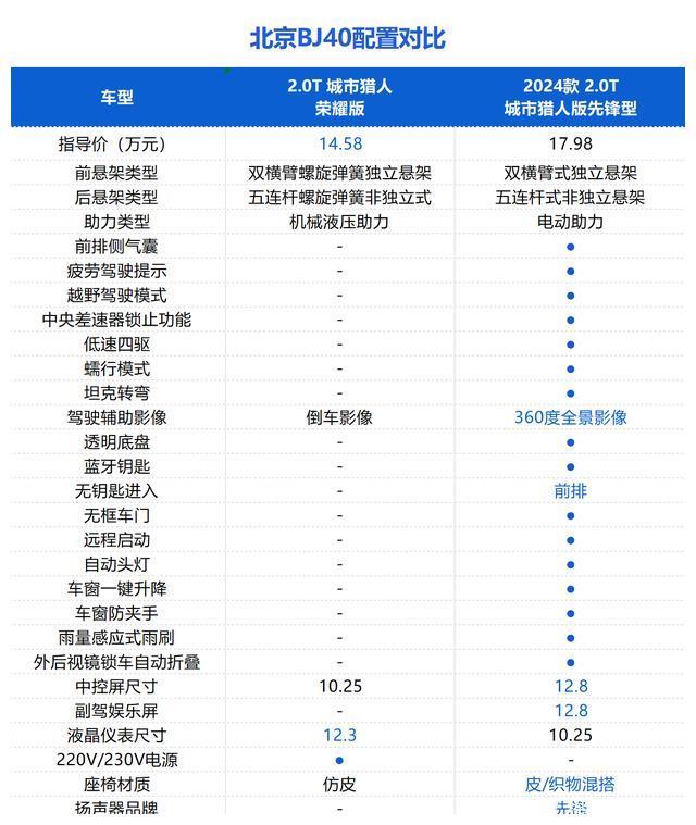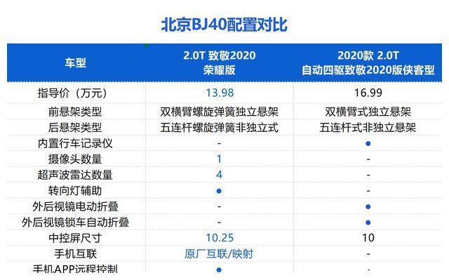 配置方面,北京BJ40荣耀版虽然价格降了不少,不过从配置上也有很明显的调整。例如致敬2020荣耀版,和2020款致敬2020版侠客行相比,二者的价格相差3.01万元,新车增加了1个摄像头、4个超声波雷达、手机app远程控制、220V/230V电源、车内PM2.5过滤装置等,中控屏尺寸更大,不过也减少了内置行车记录仪、外后视镜锁车自动折叠等功能。