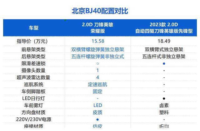 刀锋英雄荣耀版相比2023款自动四驱刀锋英雄版先锋型,价格低了2.9万元,配置多了定速巡航、车侧脚踏板、主驾电动座椅等功能,而且方向盘材质、座椅材质以及车前雾灯的光源都有提升。