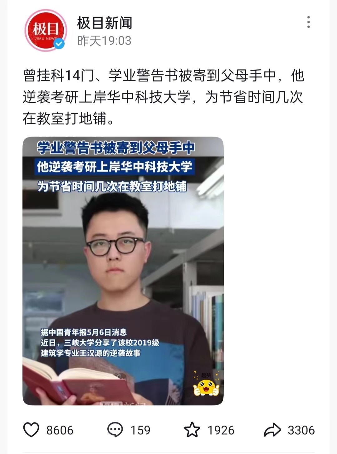 双非学生考研上岸华科大,初试392分,曾挂科14门,网友纷纷祝福
