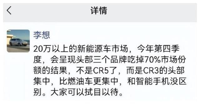 在2月26日发布业绩优异的2023年财报后,理想汽车CEO李想又发出了乐观预言:“20万以上新能源车市场,三个品牌会吃掉70%市场份额的结果。而且是CR3的头部集中,和智能手机没区别。”