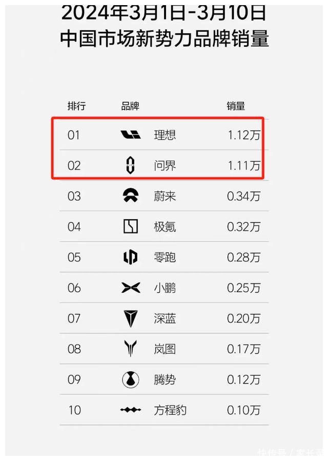 表面上的和平很快就被残酷的销量排行榜所打破。在3月12日出炉的3月前10天销量榜上,理想以100台的优势重新夺回冠军的宝座,就在1月、2月份,问界以微弱的优势蝉联第一。