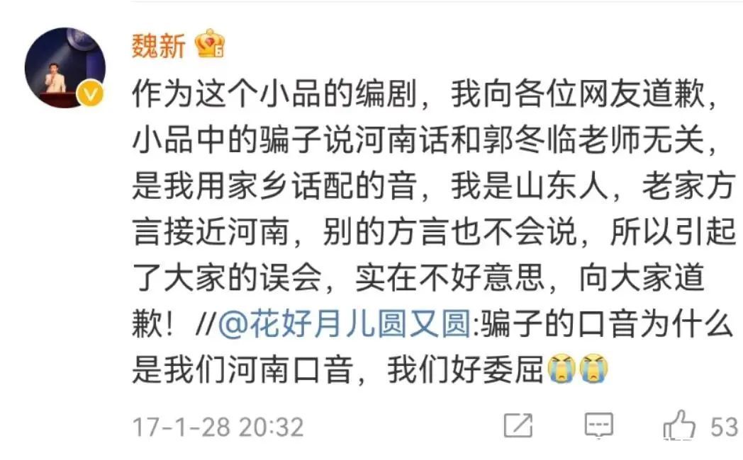但因为在小品中郭冬临假扮诈骗犯的时候却操持着一口河南口音,或许很多人并没有在意这个点,但是深知地域融入的河南人却坐不住了,认为这是在地域歧视。