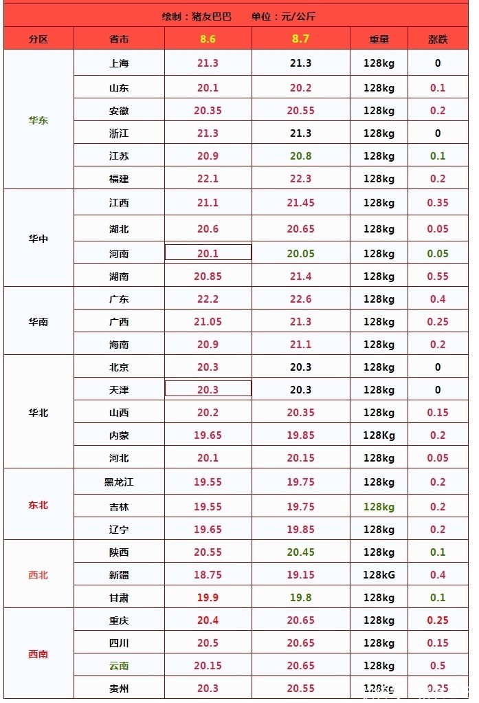 从分区来看,全国重点监测的28个地区,在南北7个生猪产区,生猪价格普遍在19.15~22.6元/公斤,其中,新疆最低,广东最高,价差在3.45元/公斤!在东北地区,黑吉辽市场报价在19.75~19.85元/公斤,在华北市场,山西以及河北报价在20.15~20.35元/公斤,在西北地区,陕甘报价在19.8~20.45元/公斤。在南方市场,川渝报价涨至20.65元/公斤,华东地区,山东以及安徽报价在20.2~20.55元/公斤,江浙地区报价在20.8~21.3元/公斤,福建报价涨至22.3元/公斤,在华中地区,河南报价在20.05元,两湖报价在20.65~21.4元/公斤,华南地区,两广市场报价涨至21.3~22.6元/公斤。