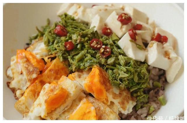 香椿豆腐煎蛋拌杂粮饭