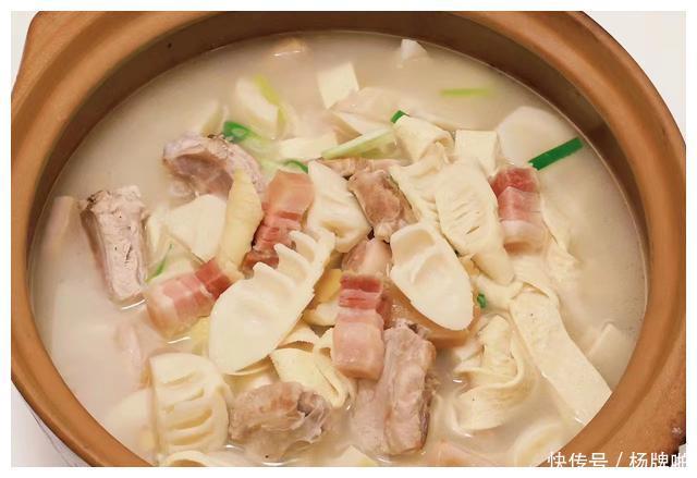 食材:春笋、咸肉、排骨、千张豆腐皮、葱结、姜片、白胡椒粉